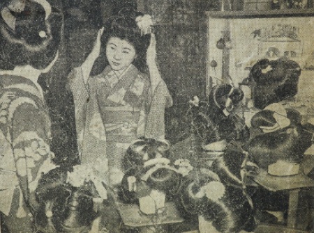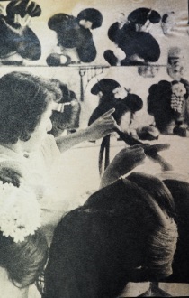 1865年、初代霜降栄吉が京都市中京区京極六角下ルで店名「嶌屋」を開設いたしました。芝居興業ともに、かづら、かもじ、頭飾品、小間物などの製造販売を興して参りました。