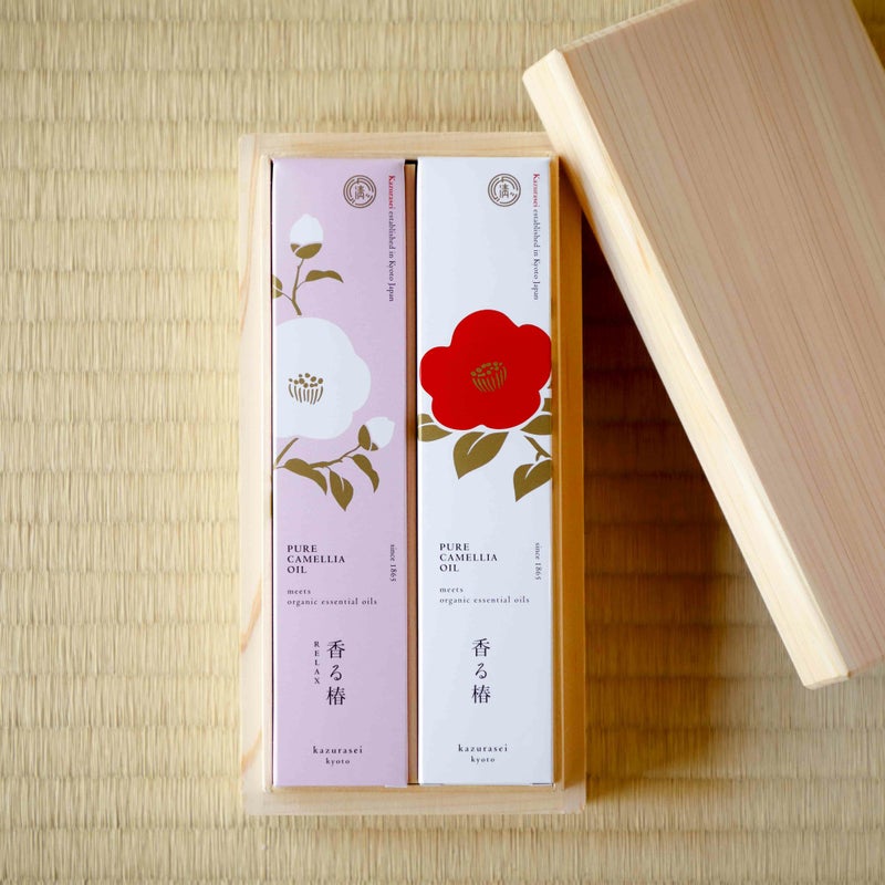特製つばき油 「香る椿」と「香る椿RELAX」の2本セットが木箱に入って登場。