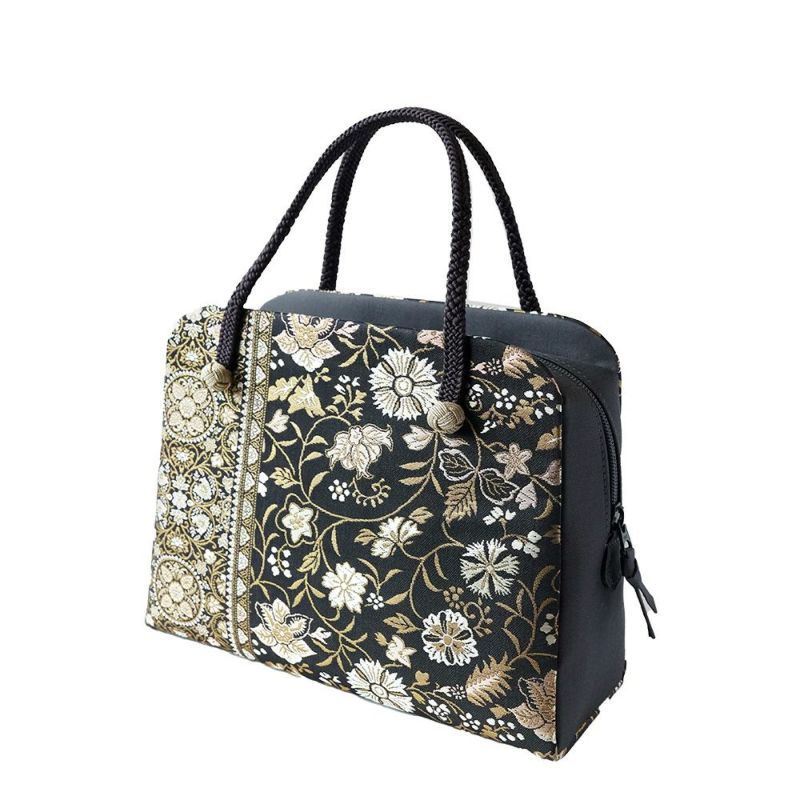 唐草花更紗文様(黒) 西陣織和装バッグ (大)
