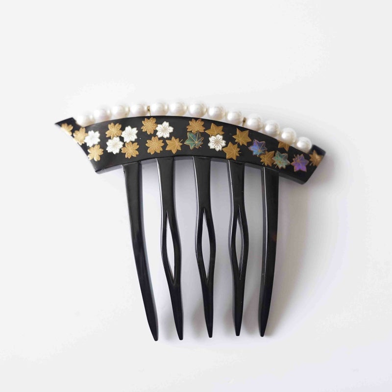 本べっ甲 純金蒔絵螺鈿コーム 更紗文様(パール付き)