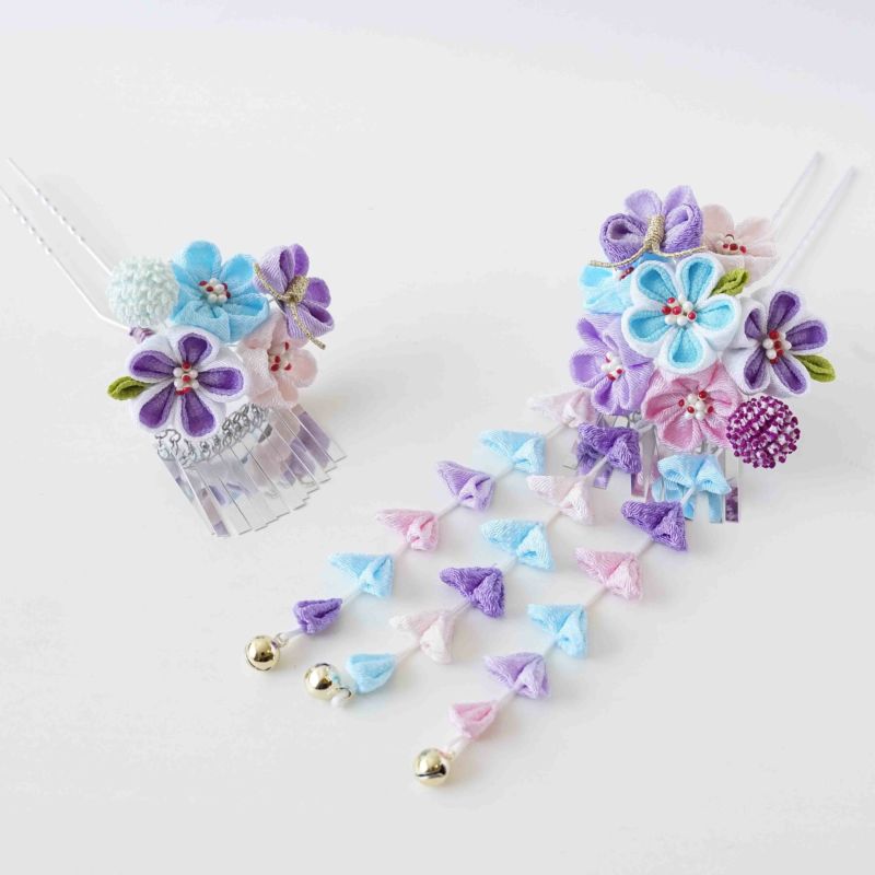 六輪かんざし(鹿の子玉付き) 三輪梅(ビラ付き)かんざし セット(紫系)