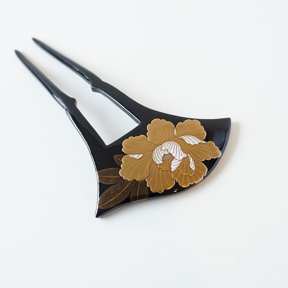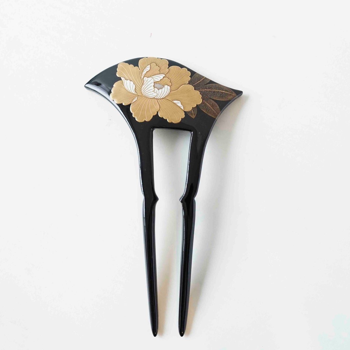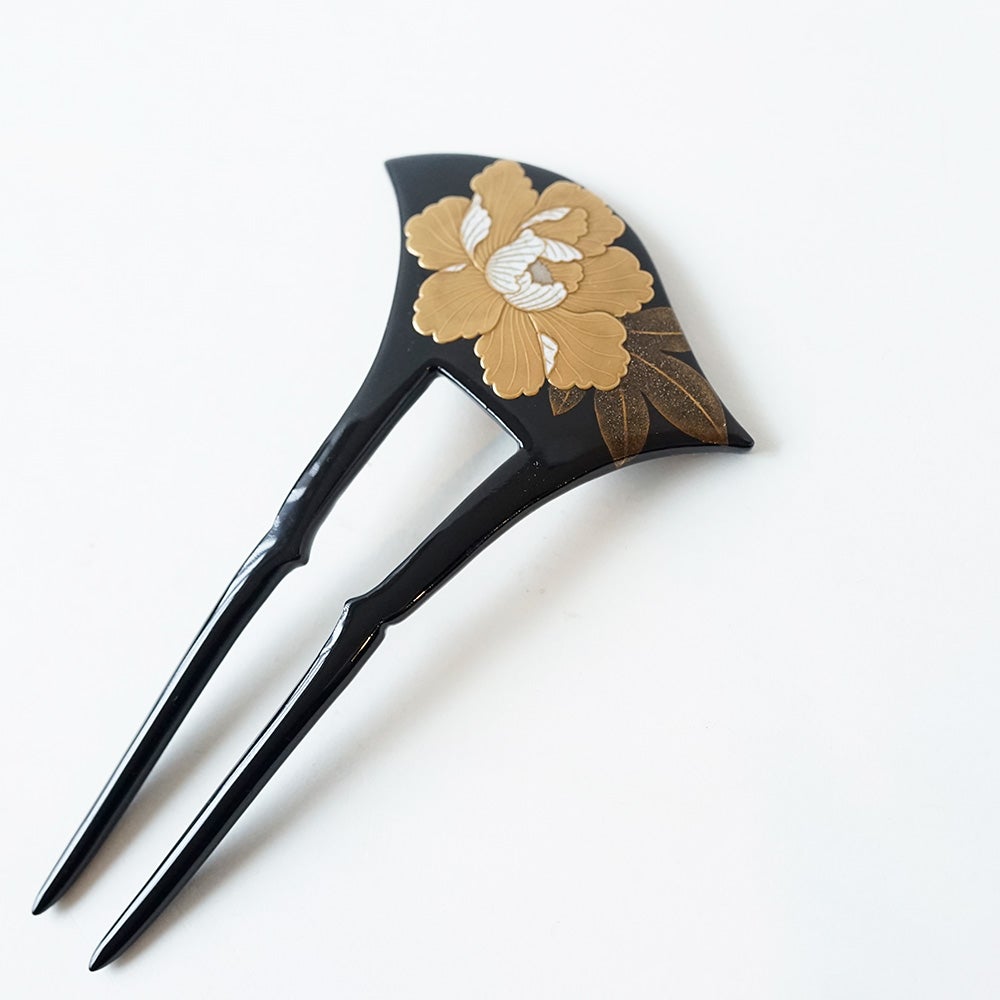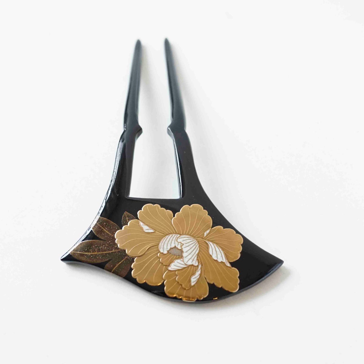 本漆純金蒔絵螺鈿かんざし 幅広輪ピン 牡丹文様