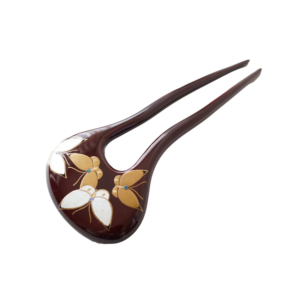 本漆純金蒔絵螺鈿かんざし 変型輪ピン 胡蝶蘭文様