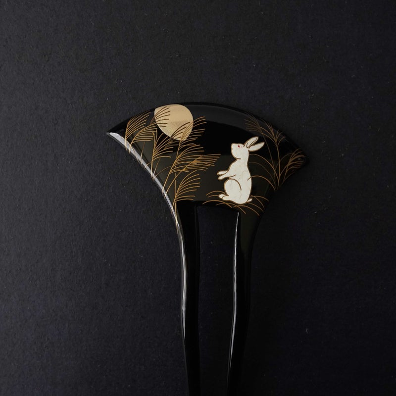 本漆純金蒔絵螺鈿かんざし 銀杏ピン(大) お月見うさぎ文様