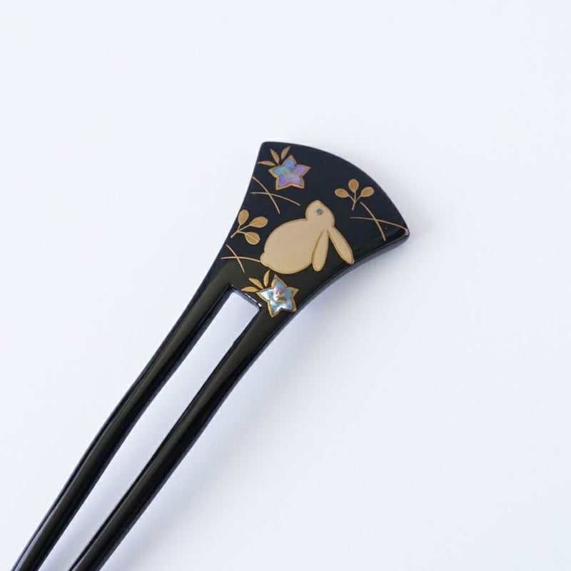 本漆純金蒔絵螺鈿かんざし 新角ピン うさぎに桔梗文様(黒色)