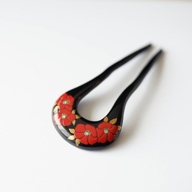 5. 本漆純金蒔絵螺鈿かんざし 輪ピン(中) 椿文様(黒色)