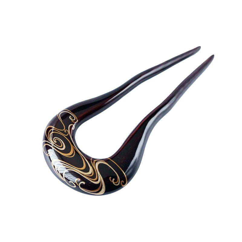 4. 本漆純金蒔絵かんざし 輪ピン(中) 流水文様(溜色)