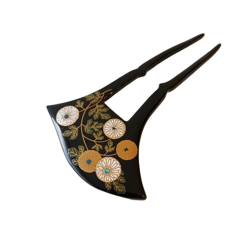 本漆純金蒔絵螺鈿かんざし 波型ピン(中) 万寿菊文様