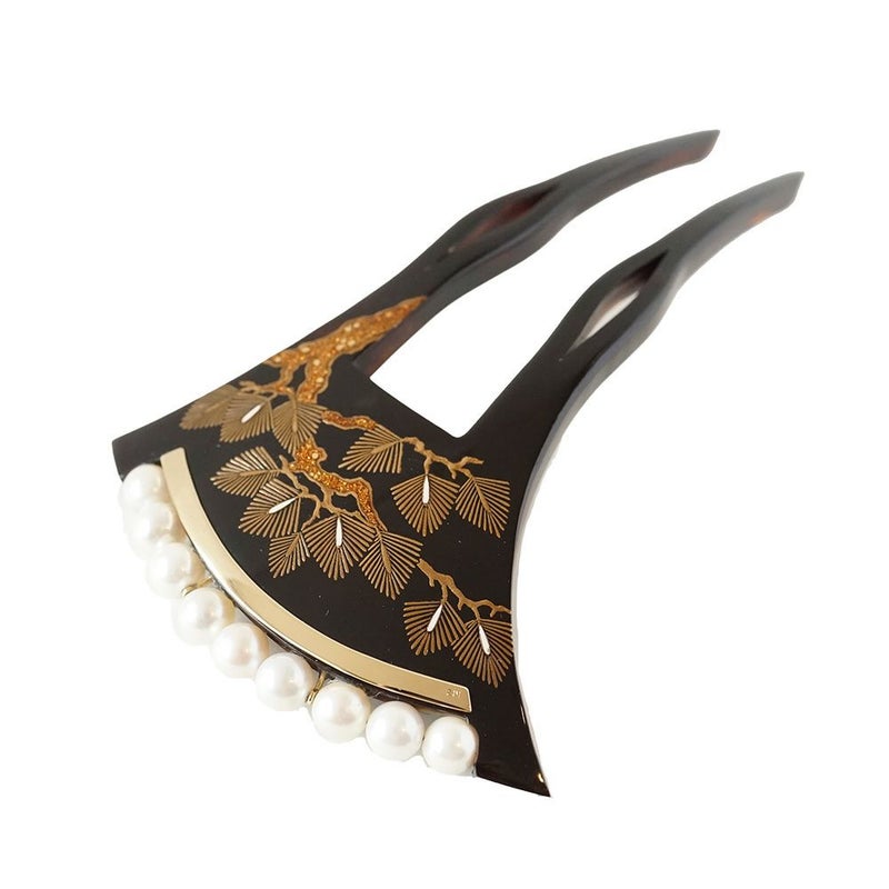 5. 本べっ甲 純金蒔絵螺鈿かんざし 松文様(パール/金)