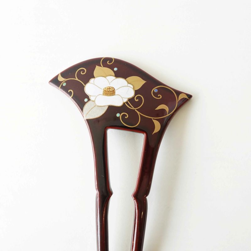 本漆純金蒔絵螺鈿かんざし 波型ピン(中) 白玉椿唐草文様