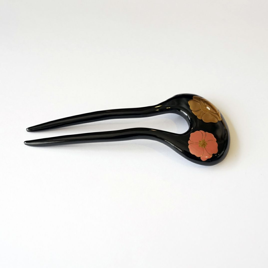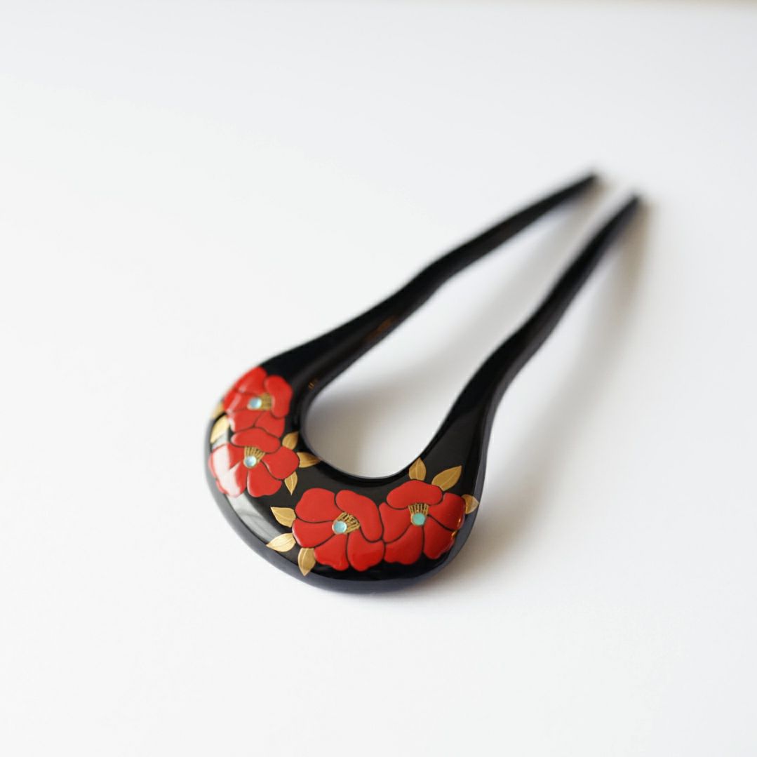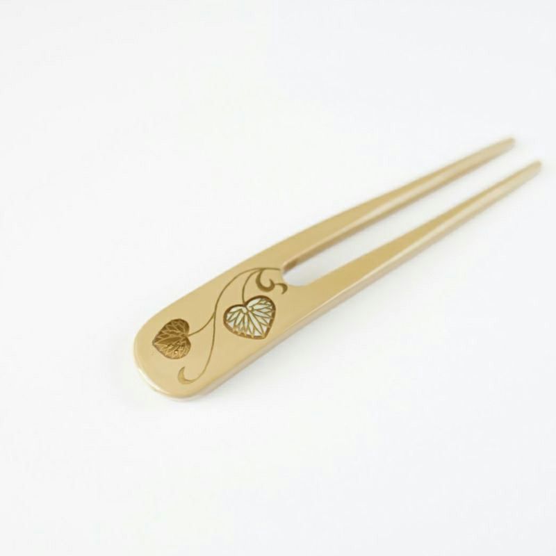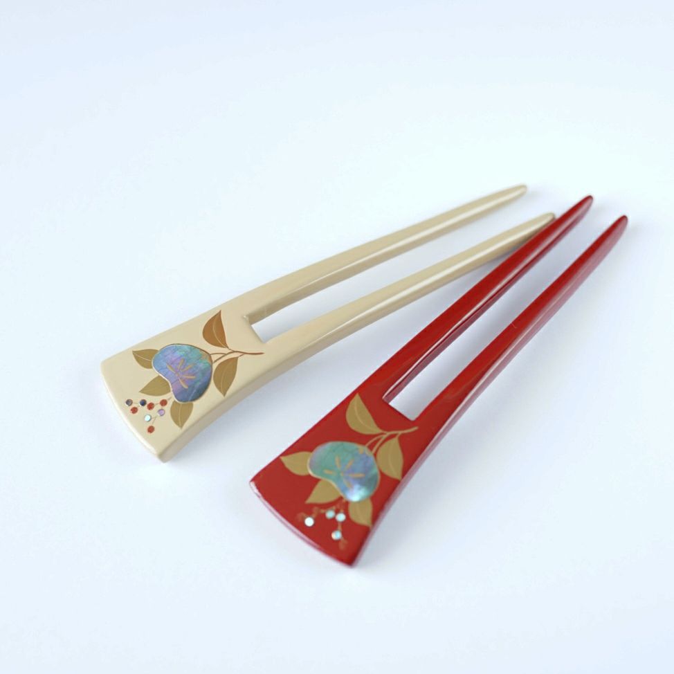 本漆純金蒔絵螺鈿かんざし 波型ピン(小) 白玉椿唐草文様
