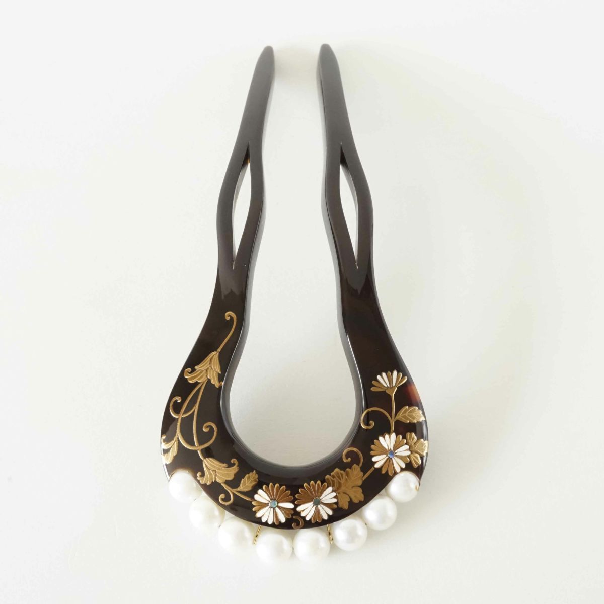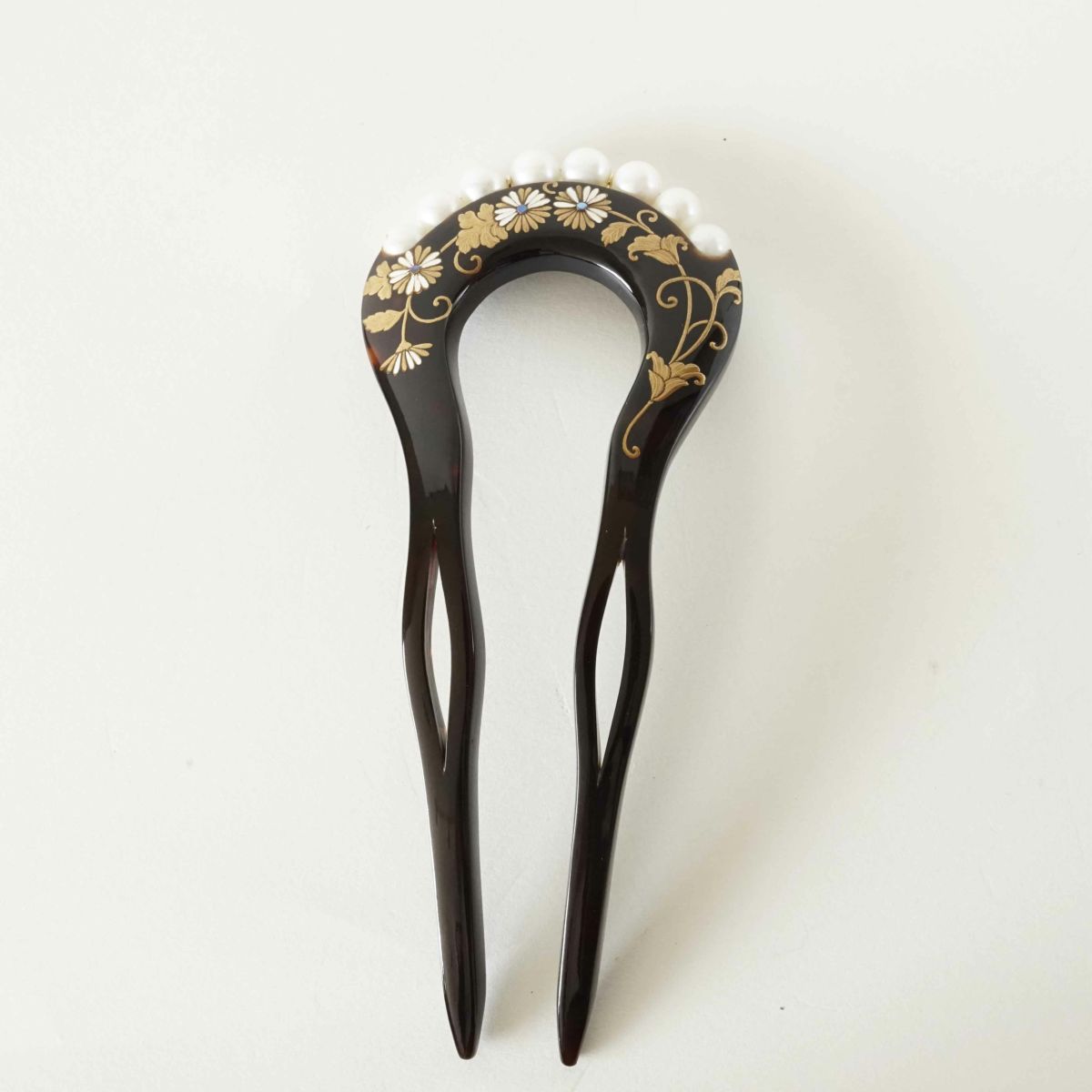 本漆純金蒔絵螺鈿かんざし 幅広輪ピン 万寿菊文様