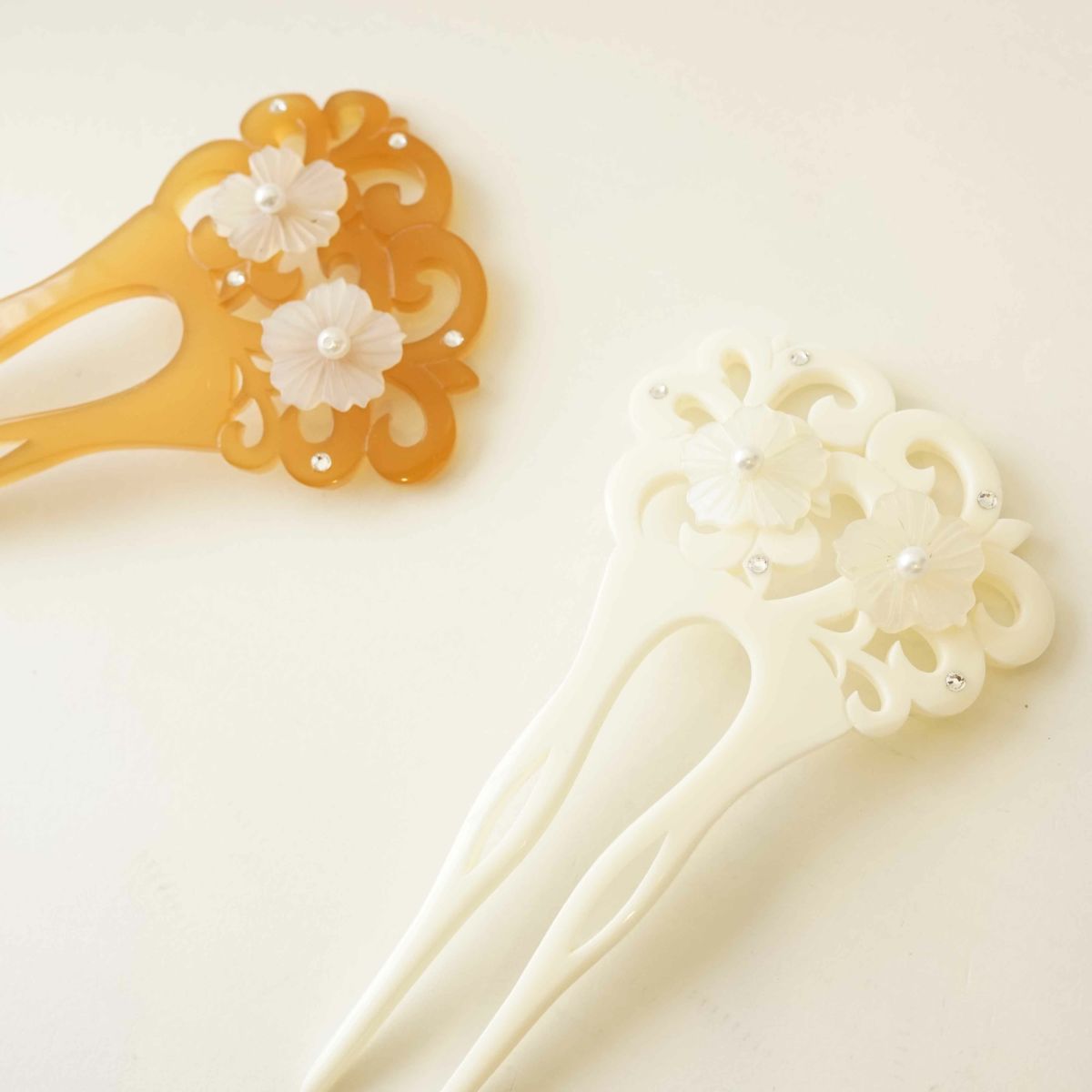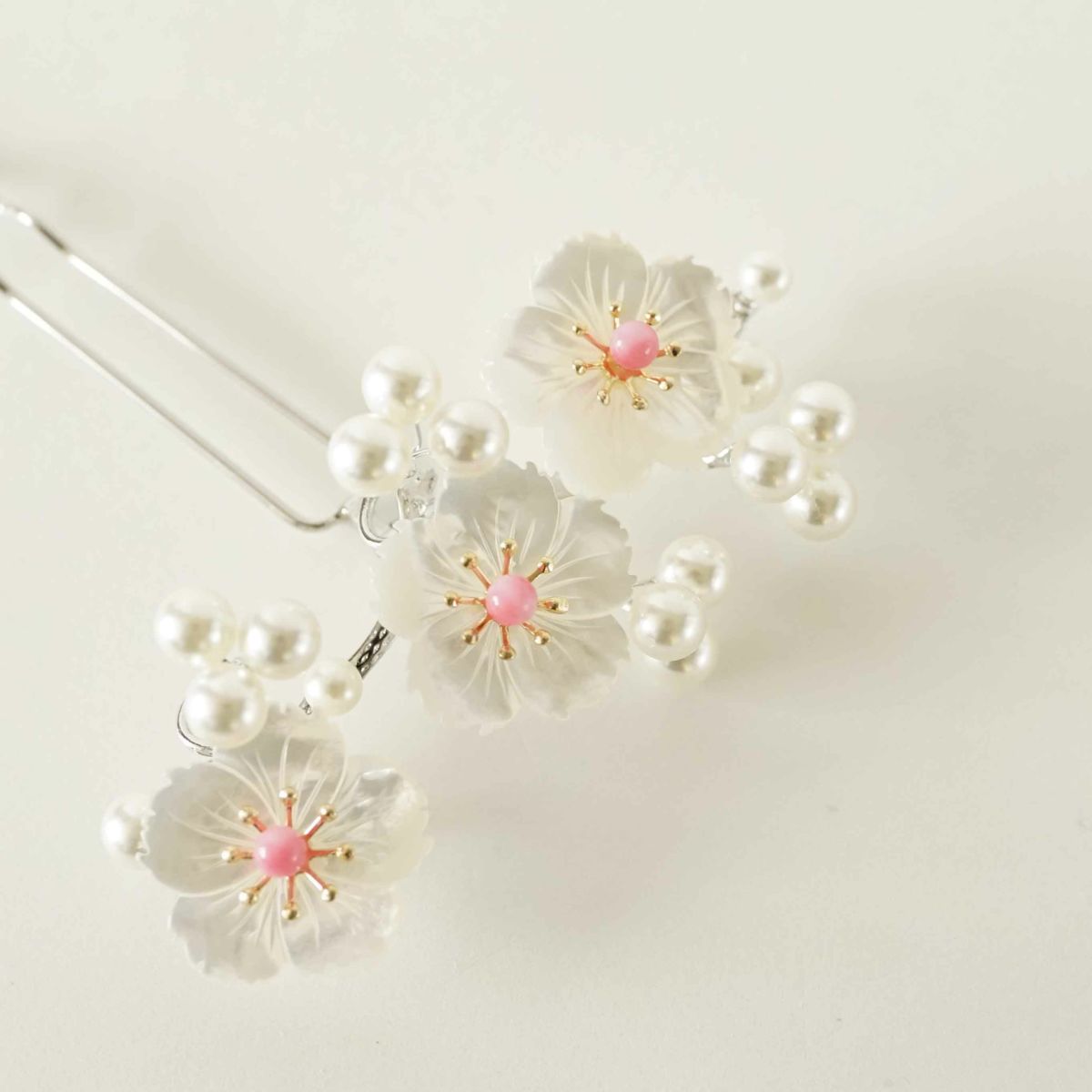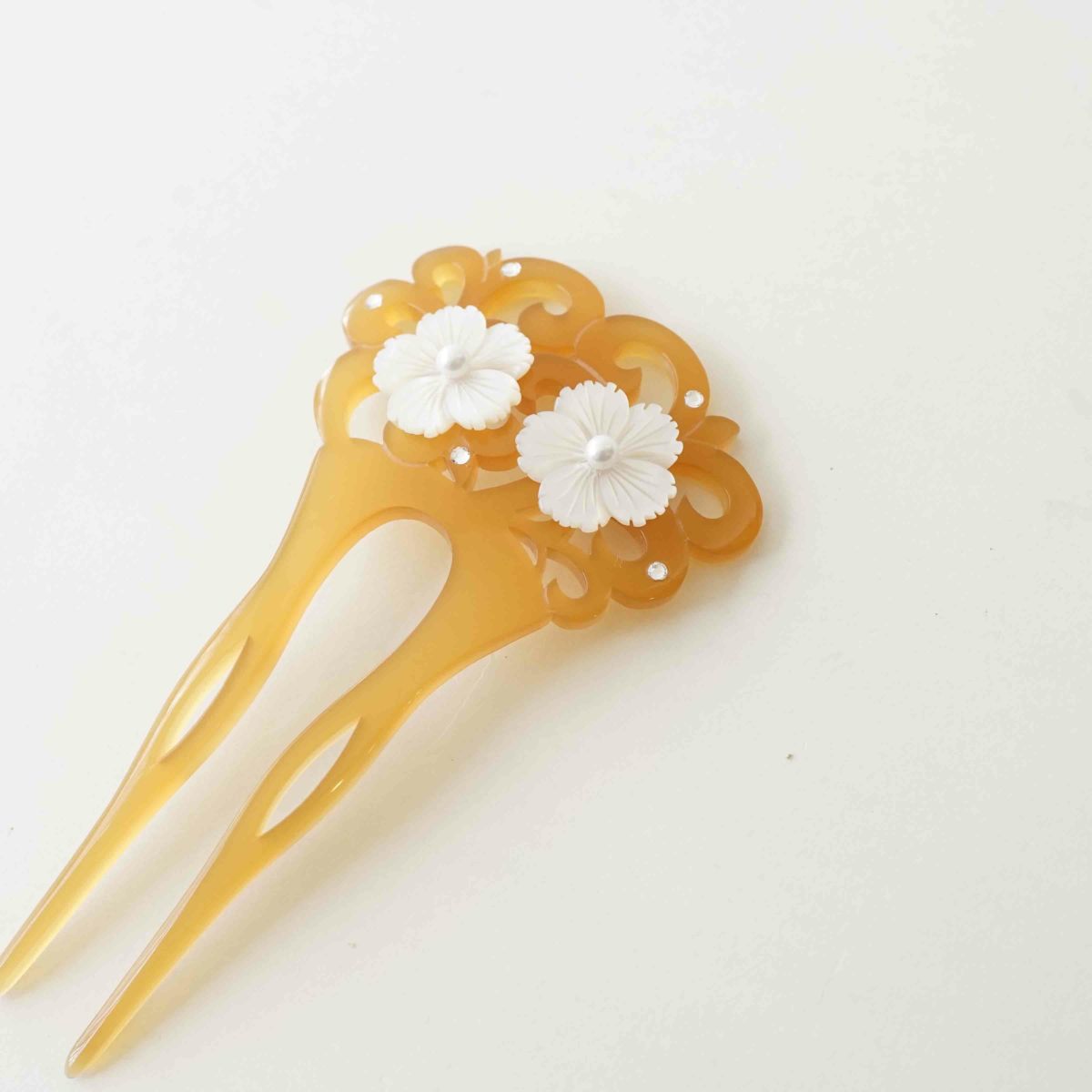 白蝶貝付き 二輪桜 かんざし(べっ甲風・象牙風)