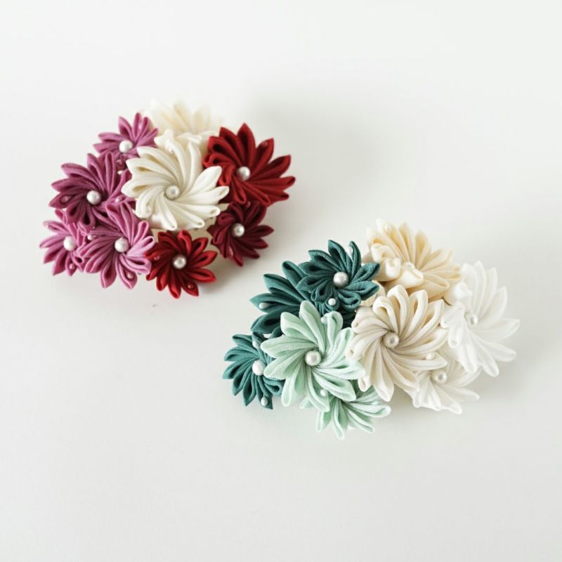 そんな日本古来の色彩でちりめんを染め上げ、まねのできない伝統の技で創りあげました髪かざりです。