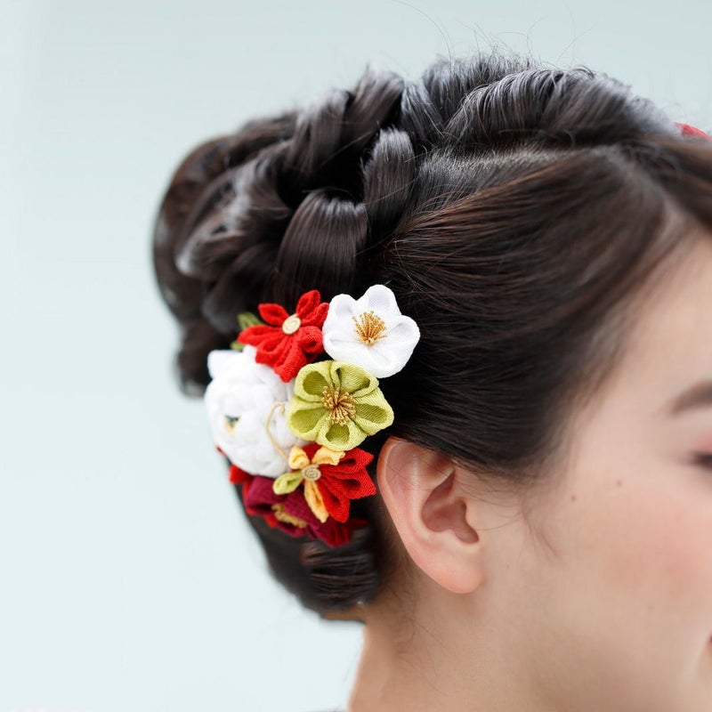 そんな日本古来の色彩でちりめんを染め上げ、まねのできない伝統の技で創りあげました髪かざりです。