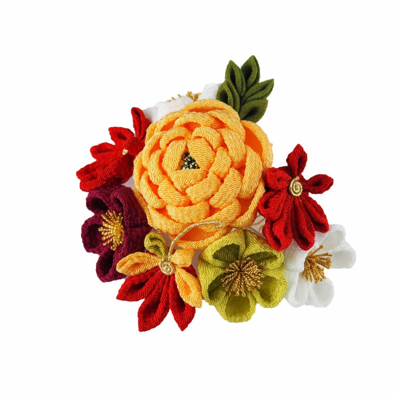 そんな日本古来の色彩でちりめんを染め上げ、まねのできない伝統の技で創りあげました髪かざりです。