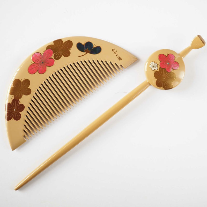 本漆純金蒔絵螺鈿かんざし 櫛・平打ちセット 梅文様(白漆)