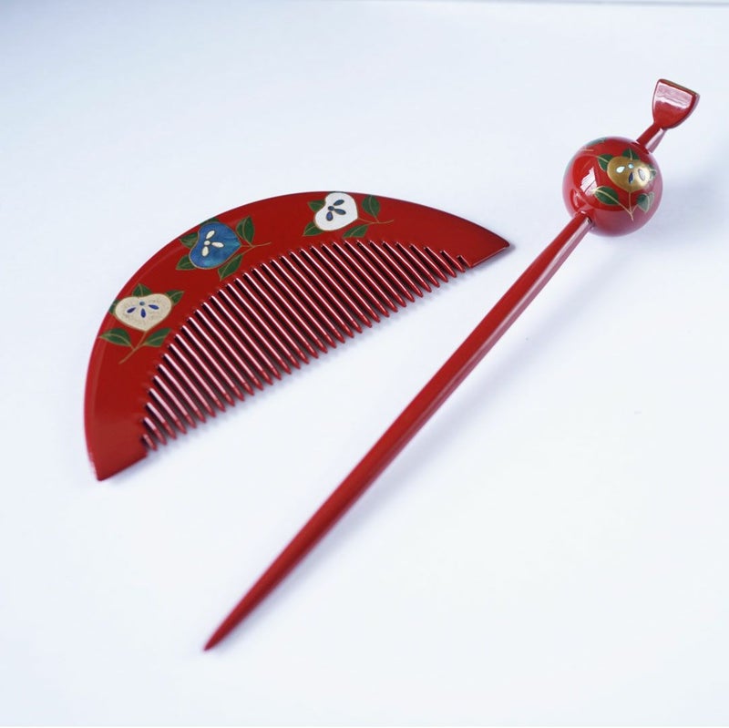 本漆純金蒔絵螺鈿かんざし 櫛・玉かんセット 橘文様(赤色)