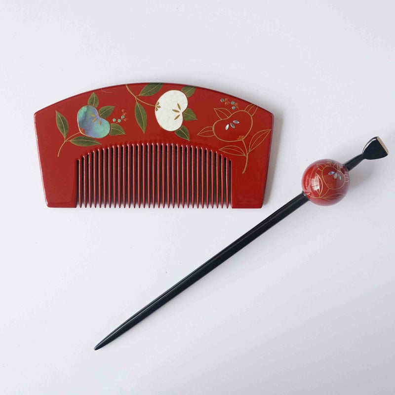 本漆純金蒔絵螺鈿かんざし 角櫛・玉簪セット 橘文様(朱)