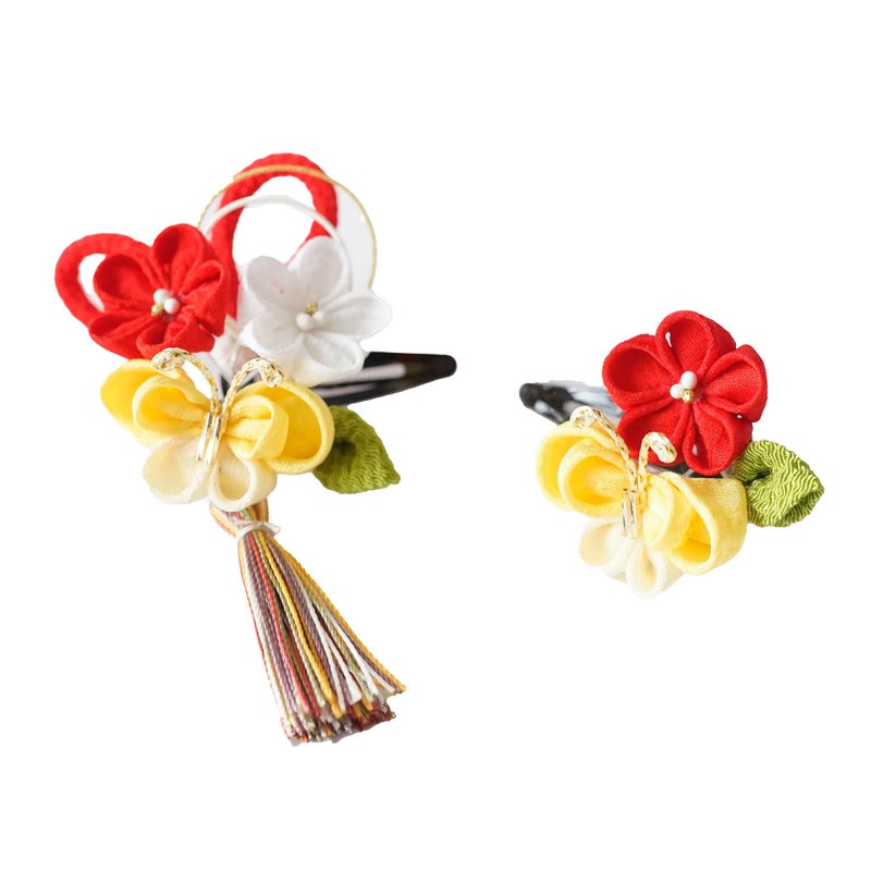 七五三用髪飾り 蝶付き二輪梅(房)と一輪梅 パッチン留めセット