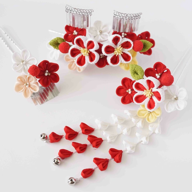 七五三髪飾り 紅白二重梅 勝山三点セット