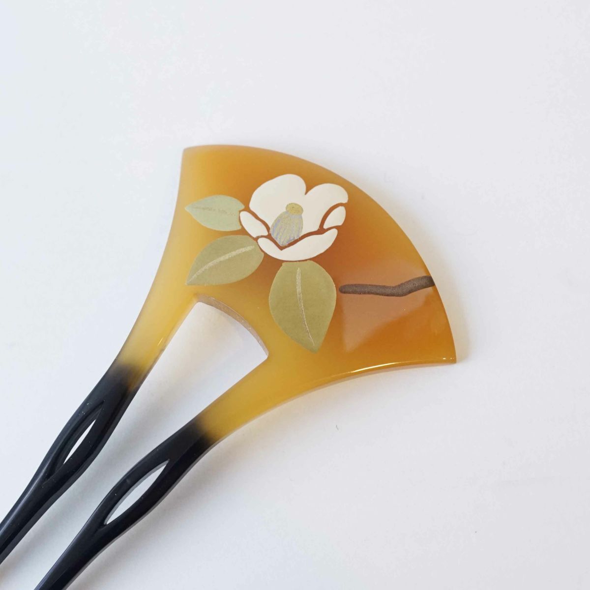 本漆純金蒔絵螺鈿かんざし 新角ピン 白玉椿文様