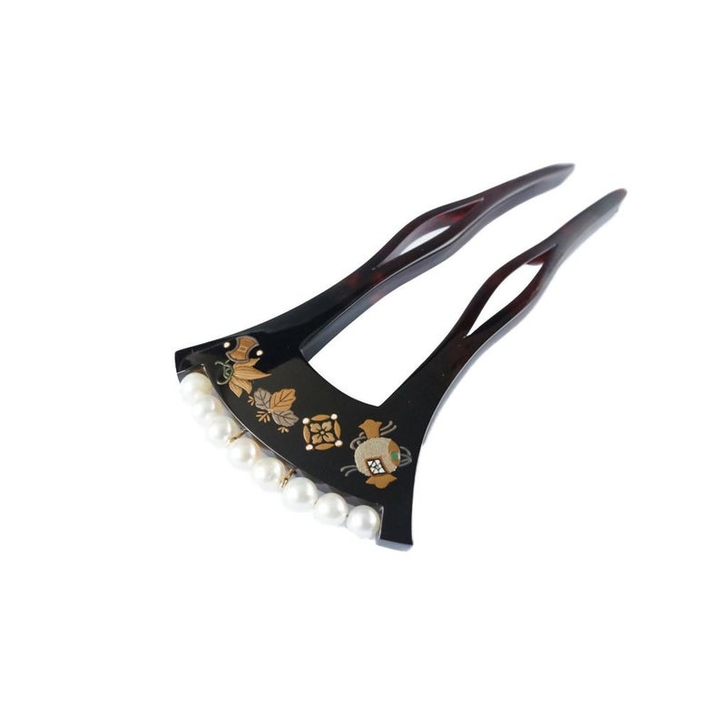 パール付きの縁起の良い宝尽くし文様のかんざし。