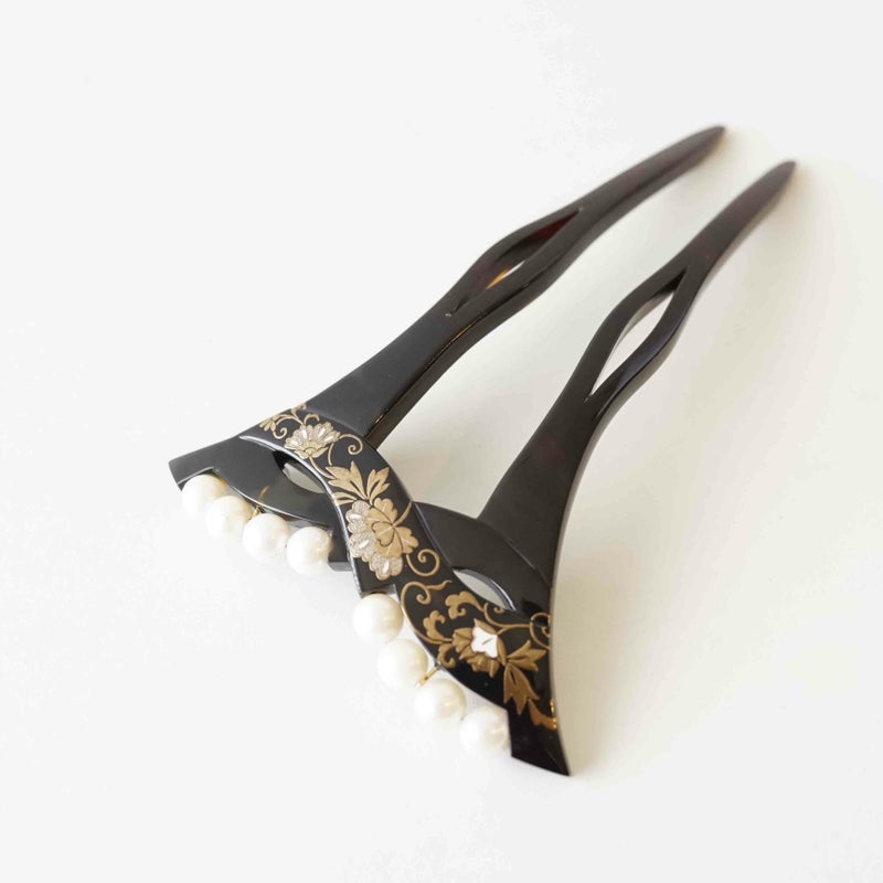 5. 本べっ甲 純金蒔絵螺鈿かんざし 変形 更紗(パール付き)
