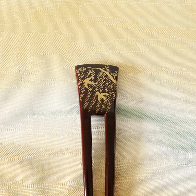 本漆純金蒔絵かんざし 角ピン 柳にツバメ(溜色)