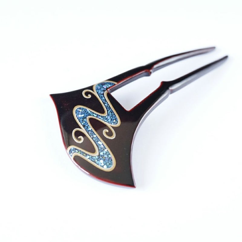 本漆純金蒔絵螺鈿かんざし 波型ピン(中) 流水文様(溜色)