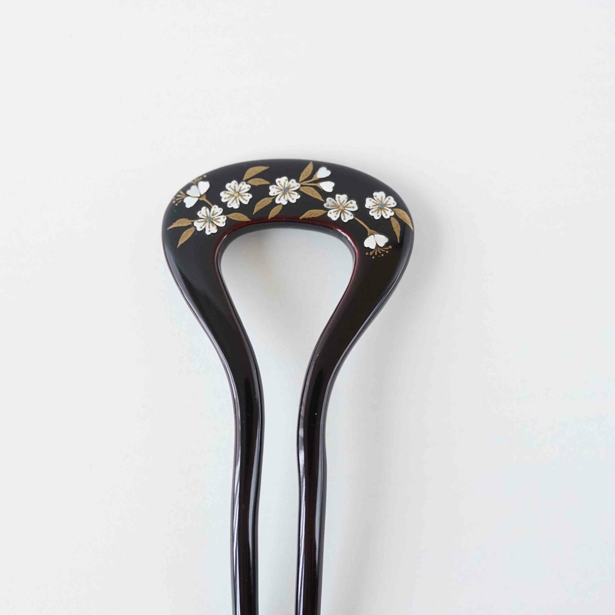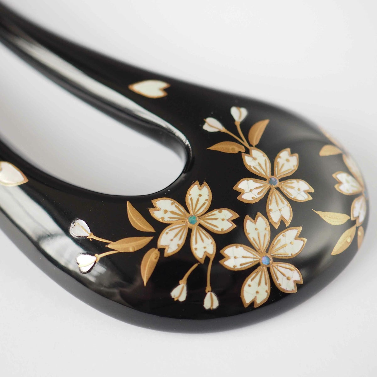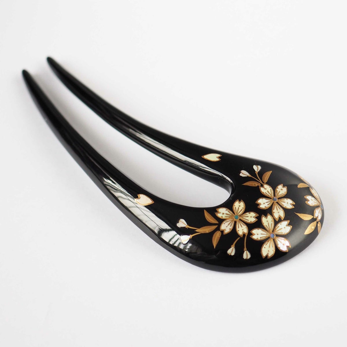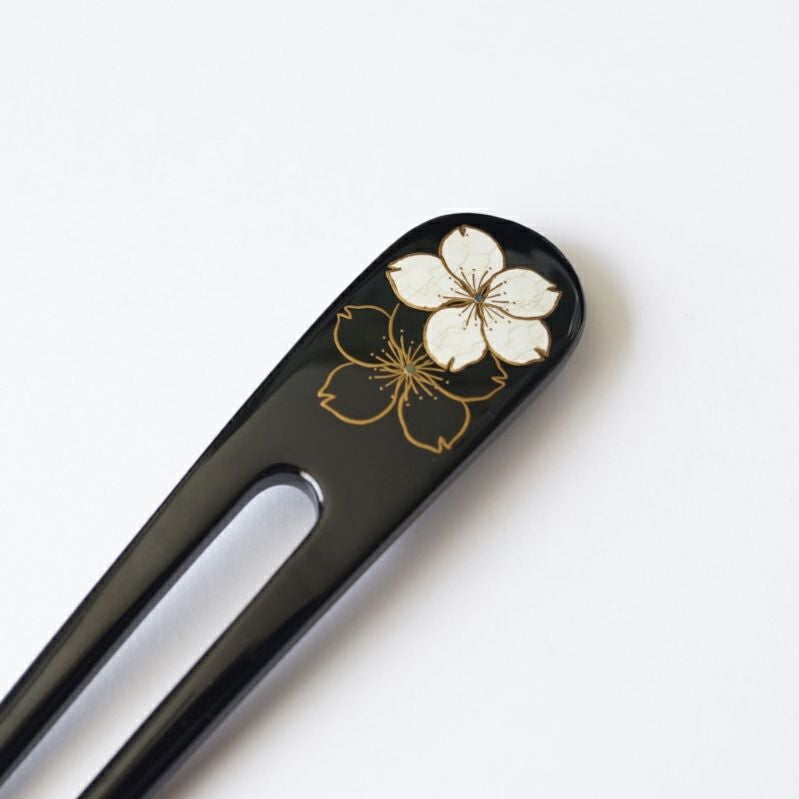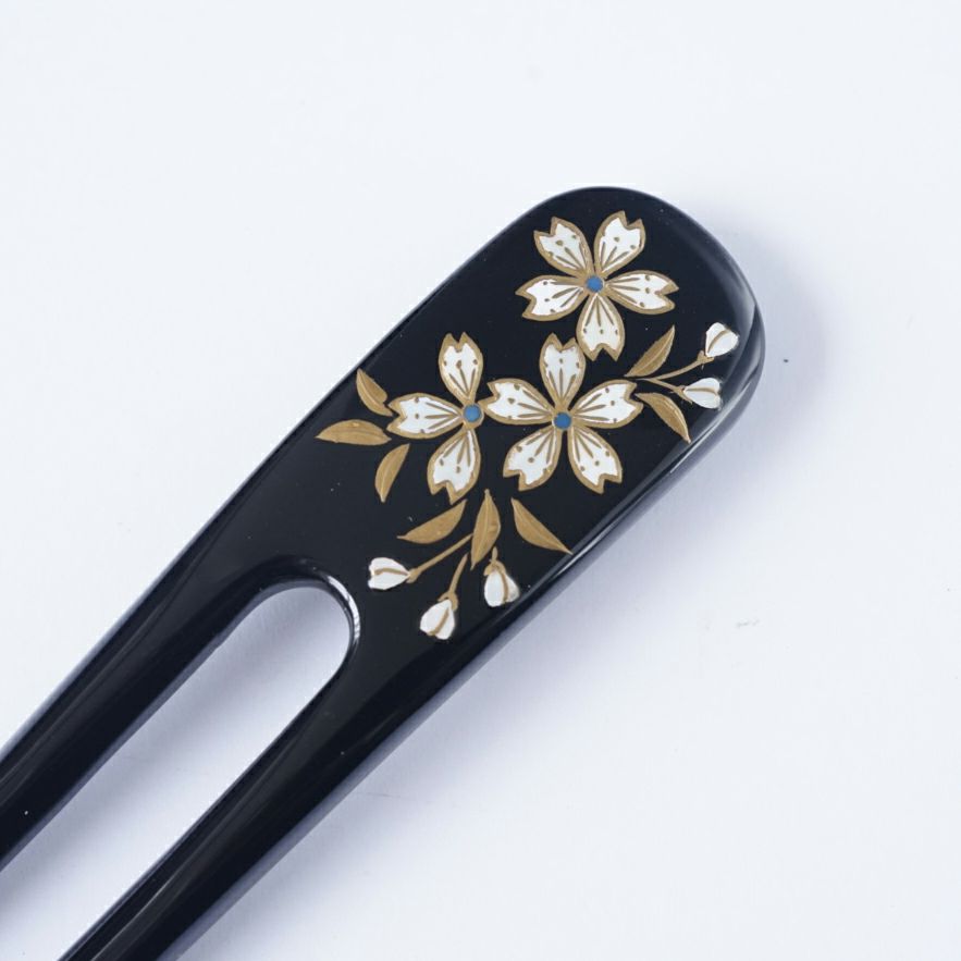 本漆純金蒔絵螺鈿かんざし 変型輪ピン 桜文様(黒色)