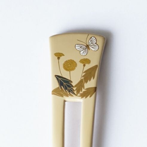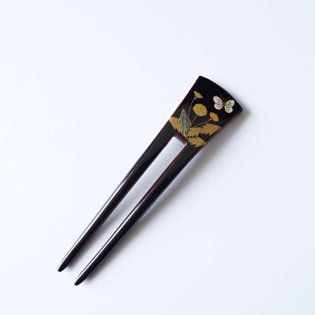 本漆純金蒔絵螺鈿かんざし 角ピン タンポポに蝶