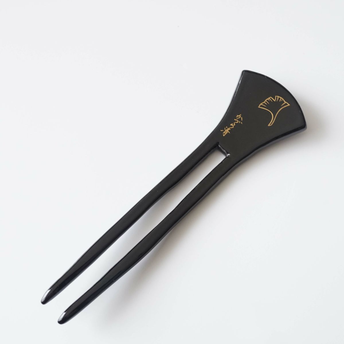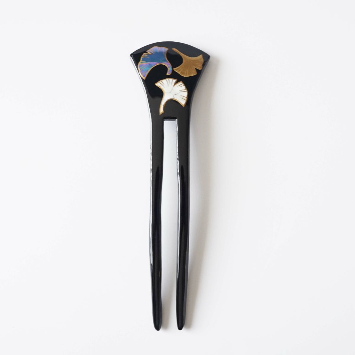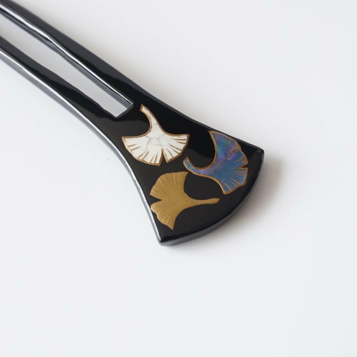 本漆純金蒔絵螺鈿かんざし 銀杏ピン 万寿菊文様