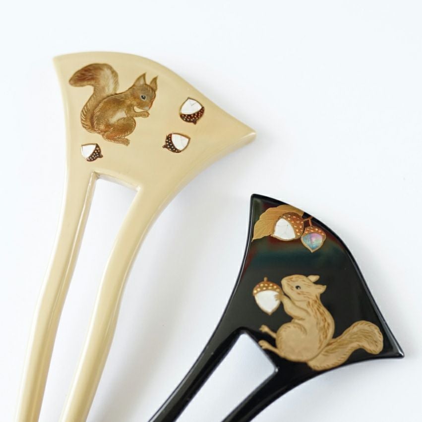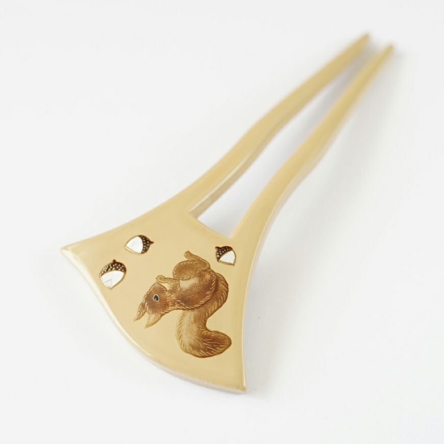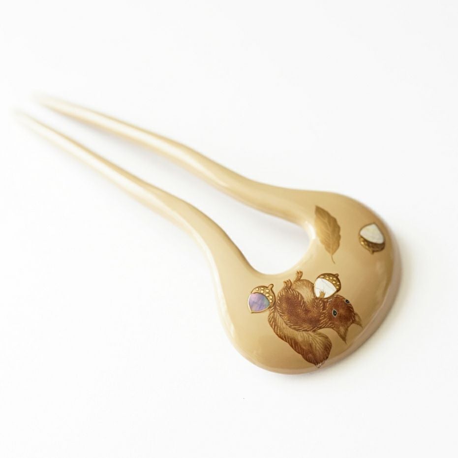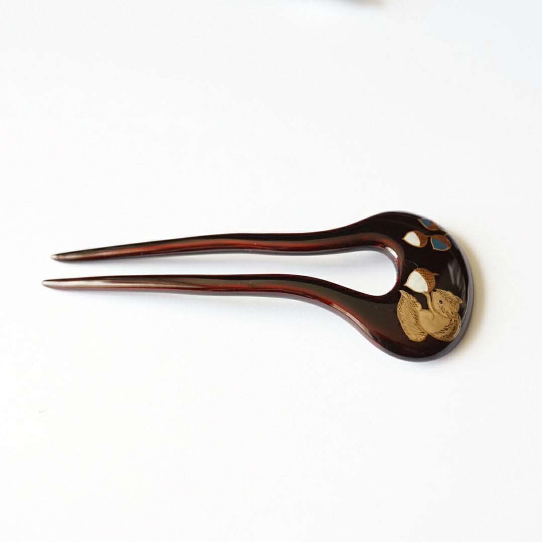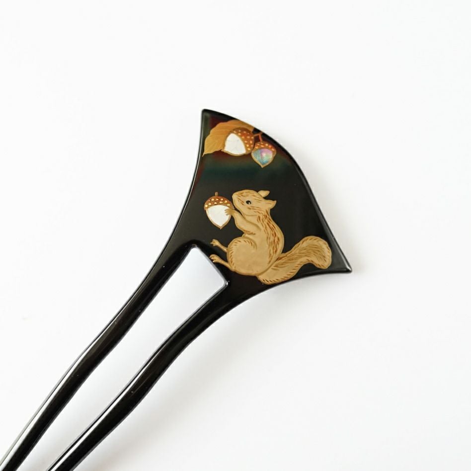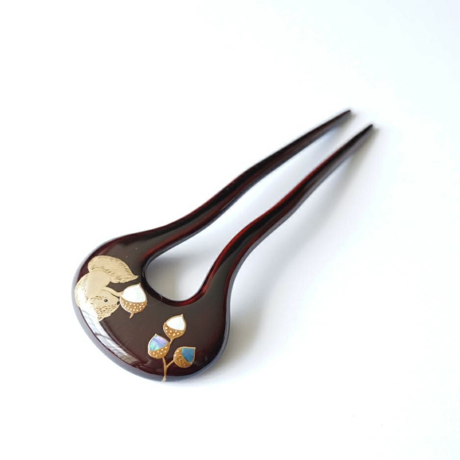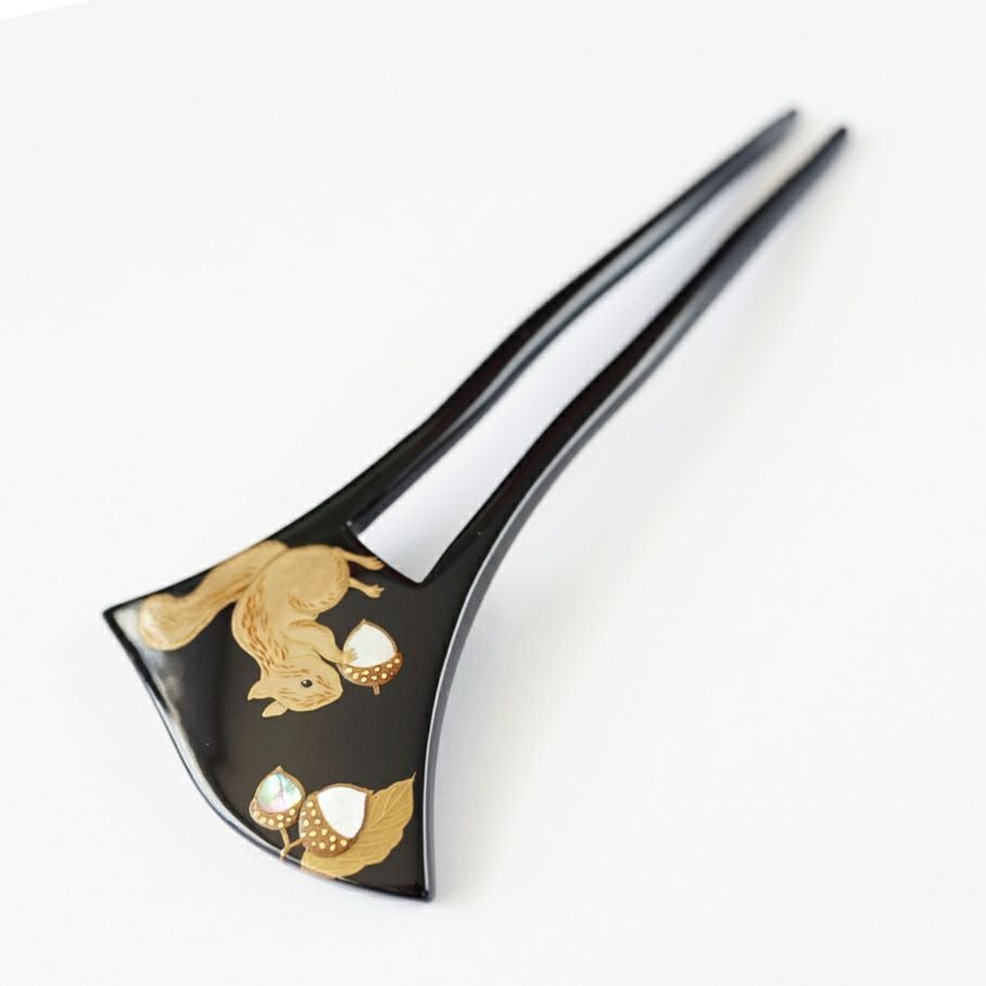 本漆純金蒔絵螺鈿かんざし 幅広輪ピン りすに団栗