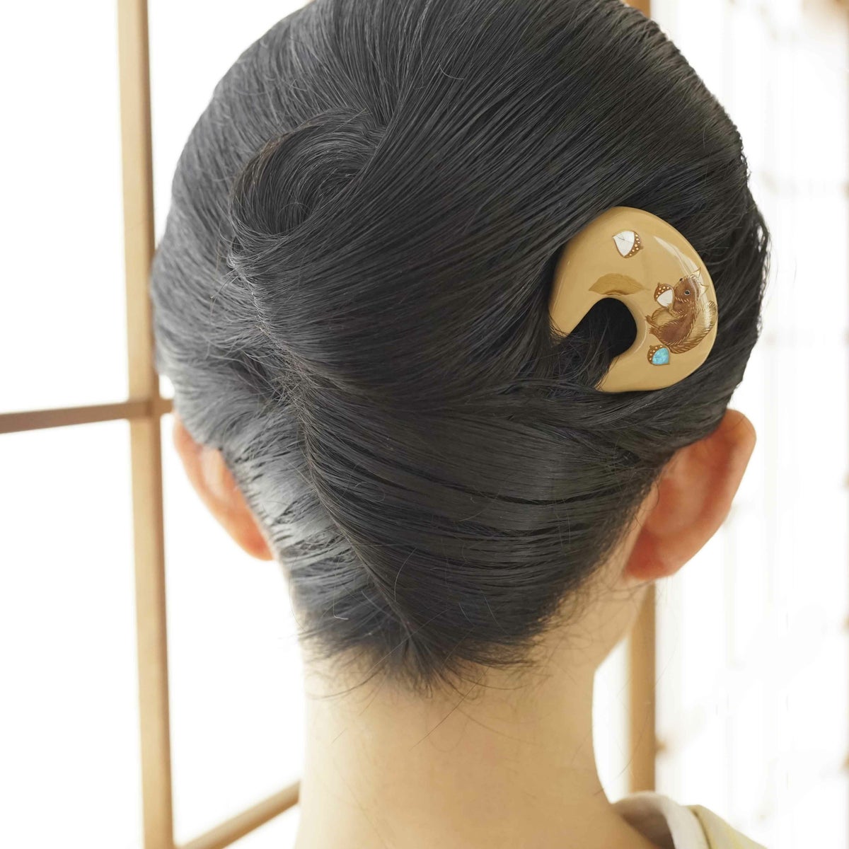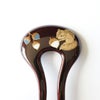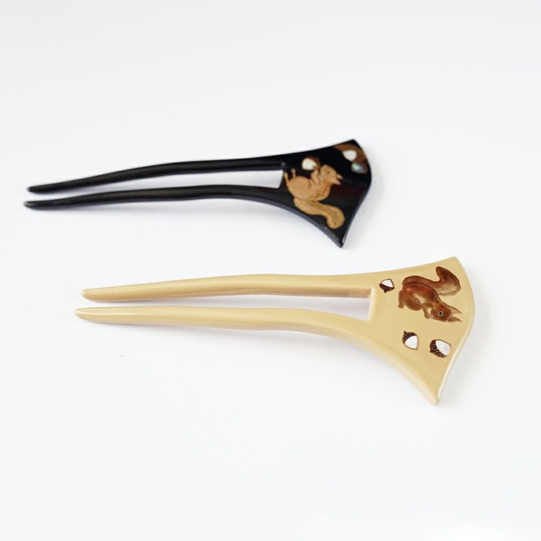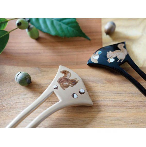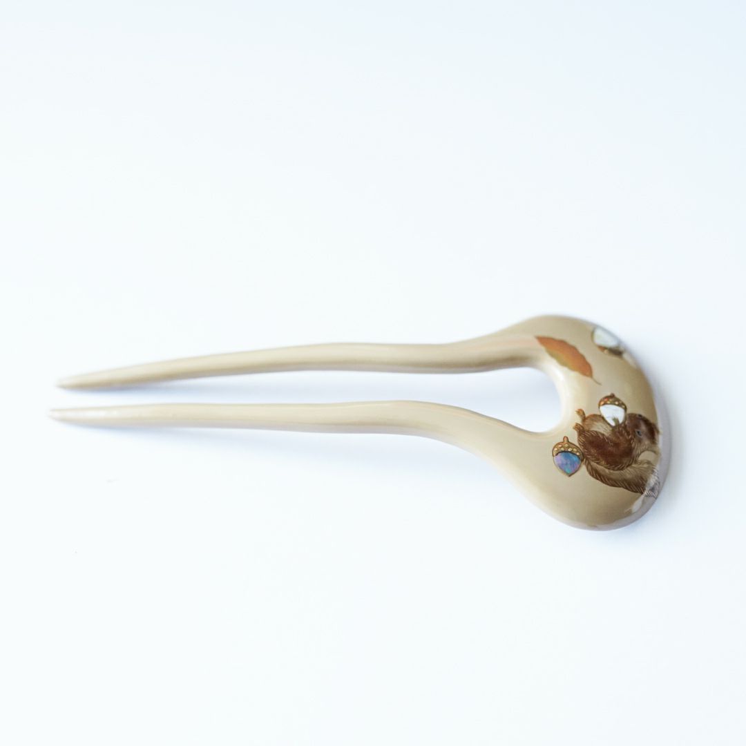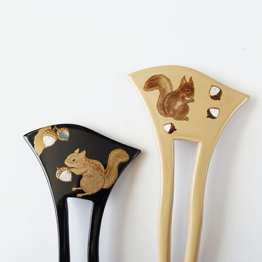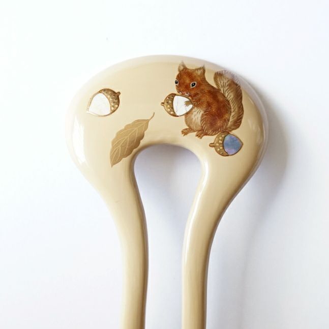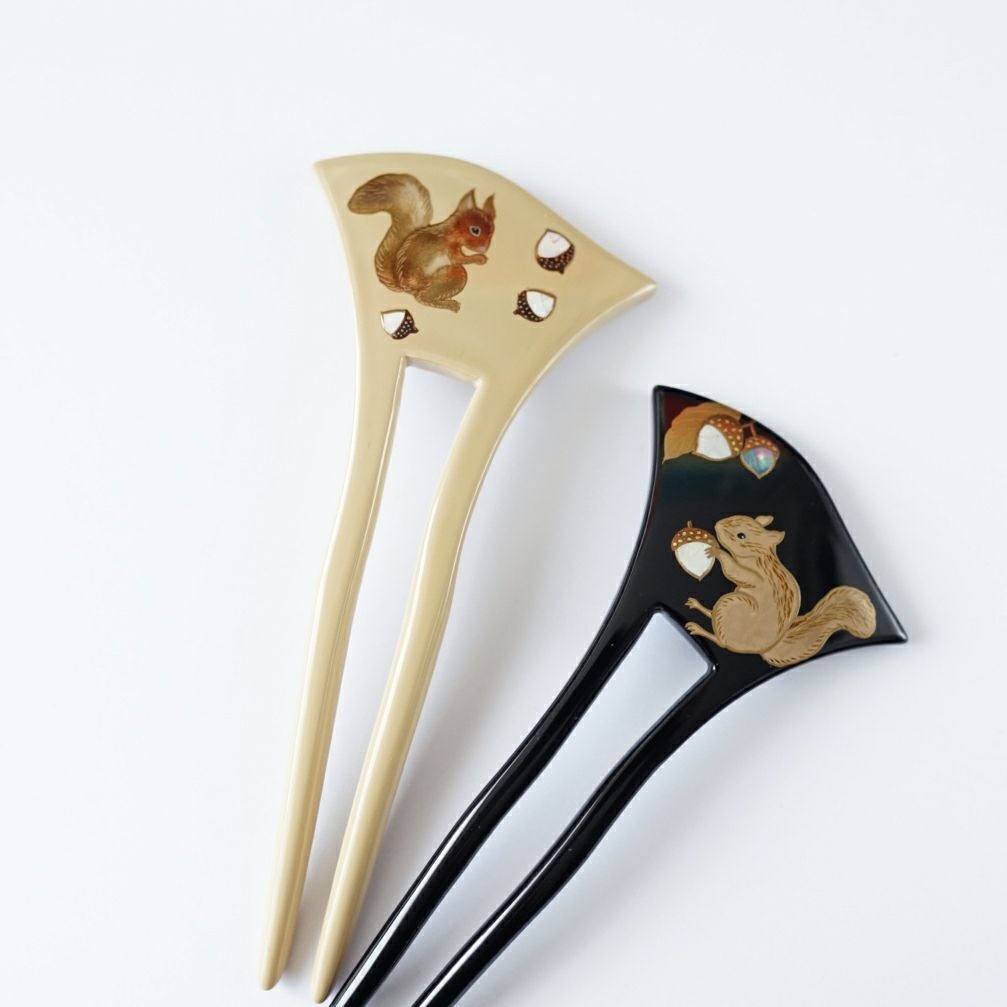 本漆純金蒔絵螺鈿かんざし 幅広輪ピン りすに団栗