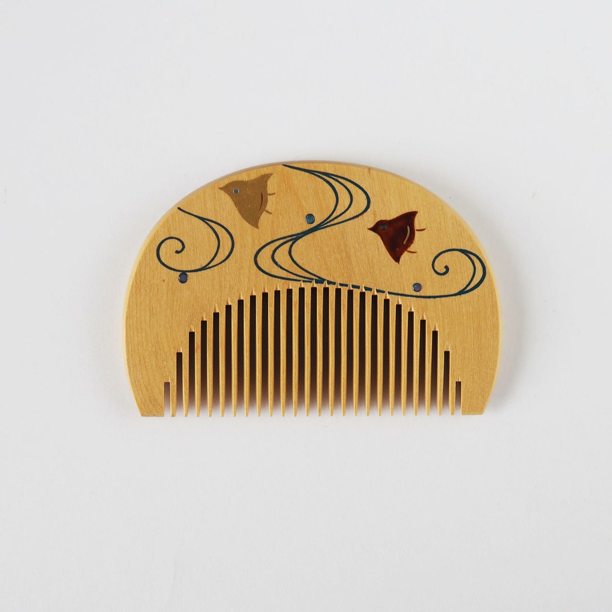 日本の熟練した櫛職人が歯を1本1本丹精込めて挽いて作った本つげ櫛に、本漆と夜光貝を用い、工房にて手作りで蒔絵をしているオリジナル品です。携帯用として、出先で髪の乱れを整える時に、愛らしくおしゃれにお使いいただけます。