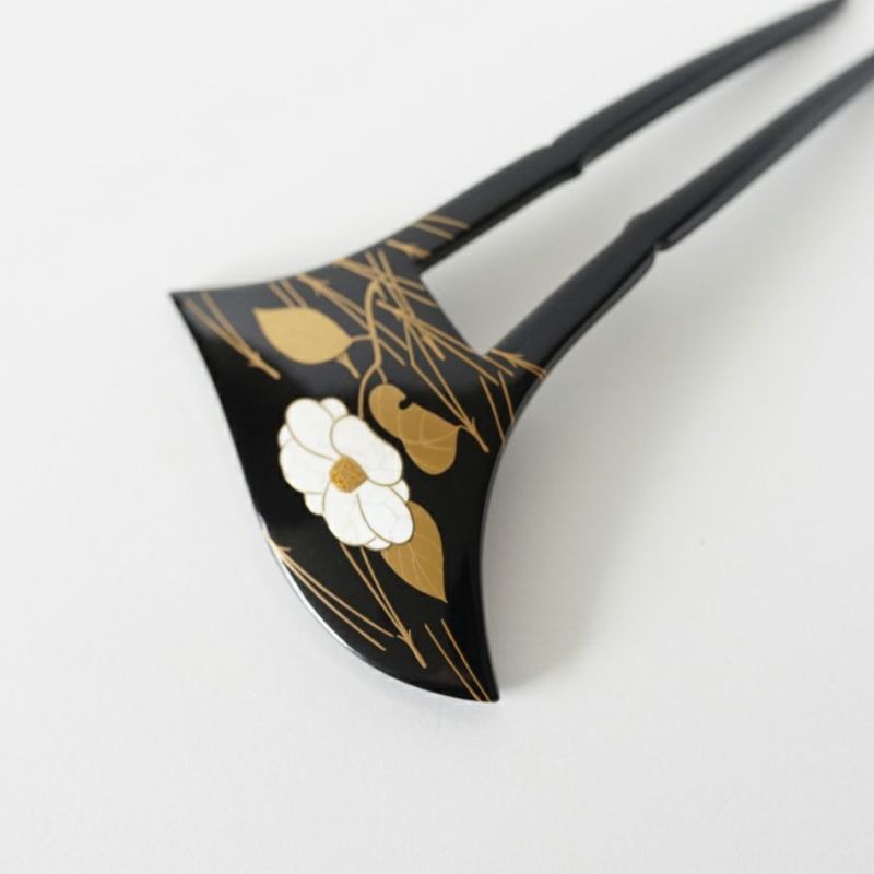 本漆純金蒔絵螺鈿かんざし 波型ピン(大) 白玉椿に松葉