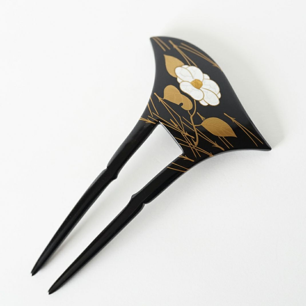 本漆純金蒔絵螺鈿かんざし 新角ピン 白玉椿文様