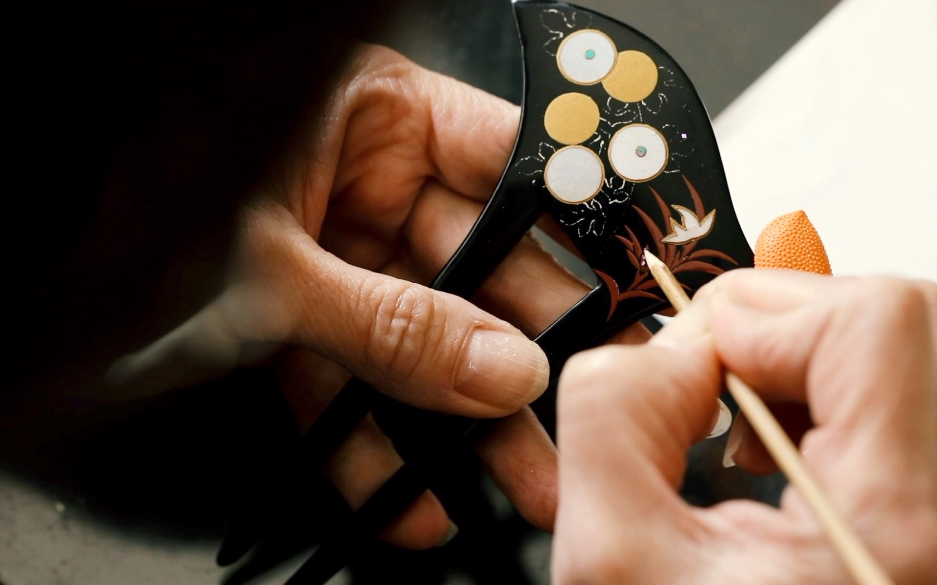 かづら清加賀工房で製作する本漆のかんざしは、木地作り・漆塗り・蒔絵・螺鈿細工などの丹念な手技により、3カ月以上かけて創り上げられています。