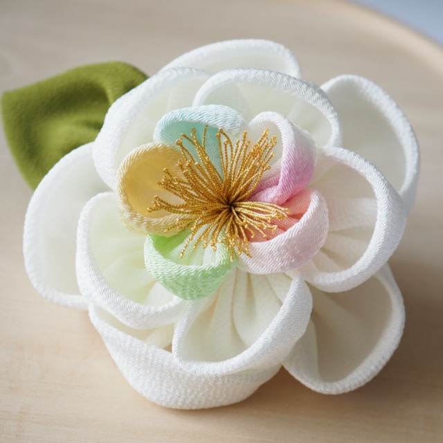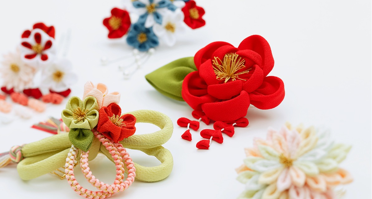 ちりめん髪飾りは、日本古来の色彩でちりめんを染め上げ、伝統の技で創りあげられています。