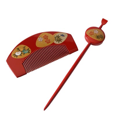 本漆純金蒔絵螺鈿かんざし 櫛・平打ちセット 貝合わせ文様(朱)のレビューを書く