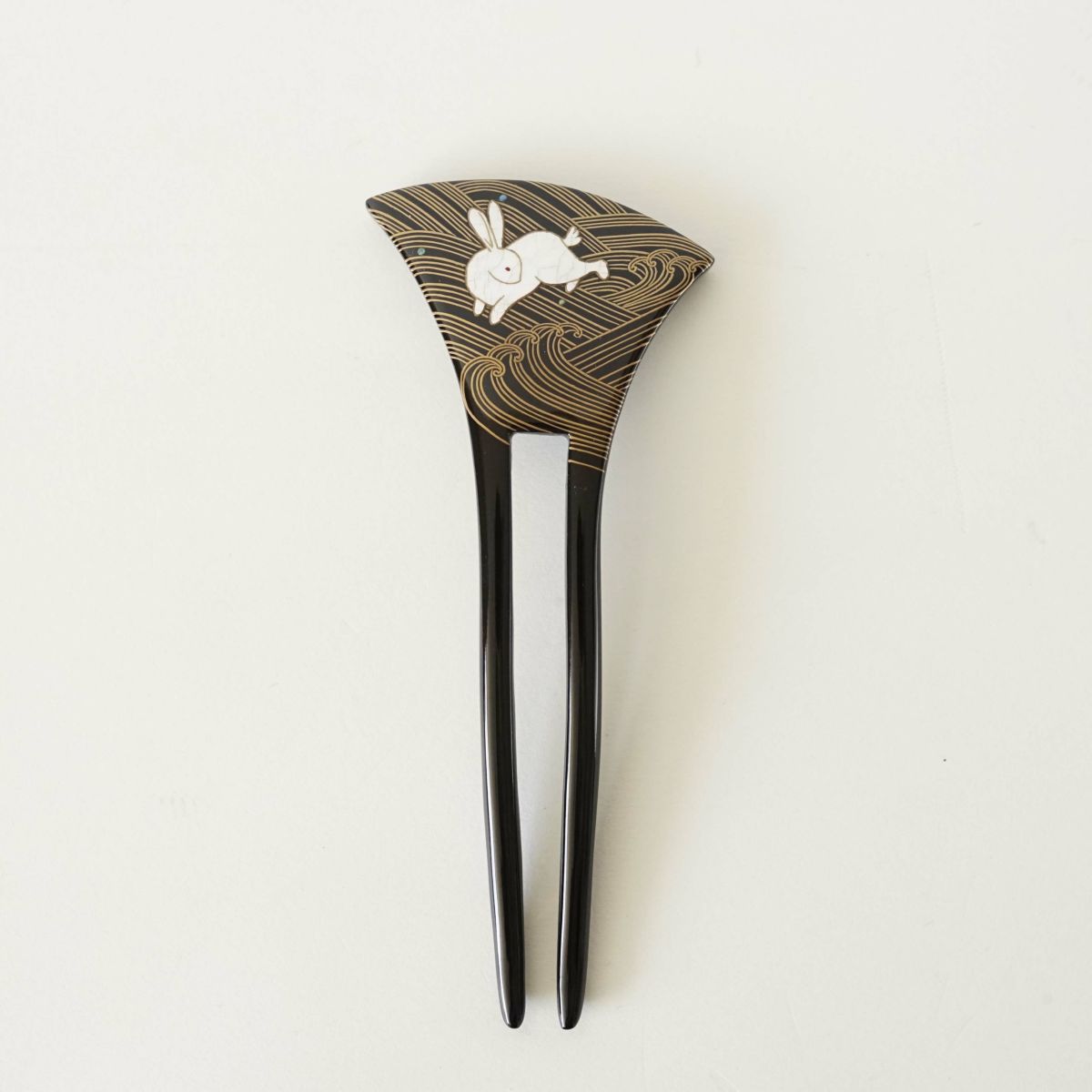 本漆純金蒔絵螺鈿かんざし 波型ピン(中) 波うさぎ文様